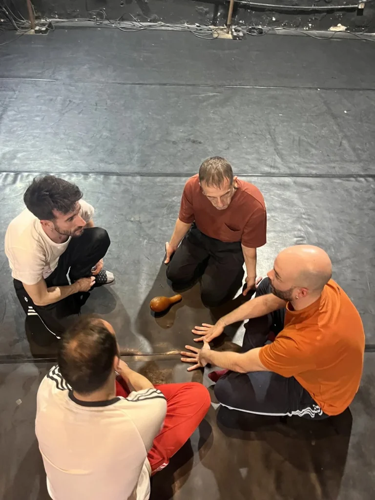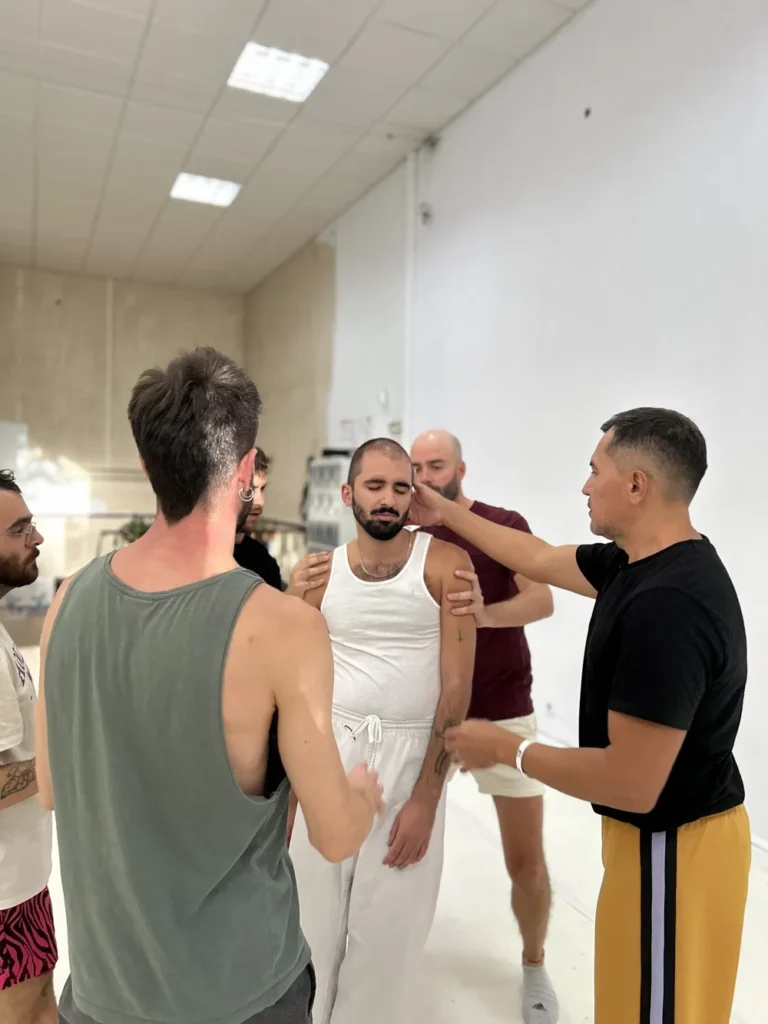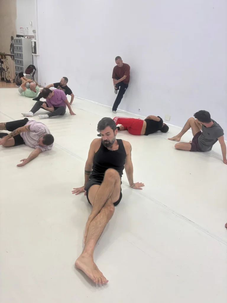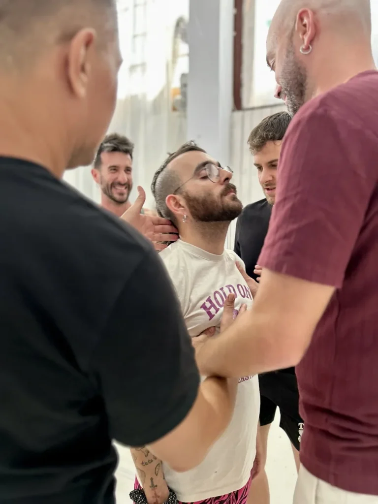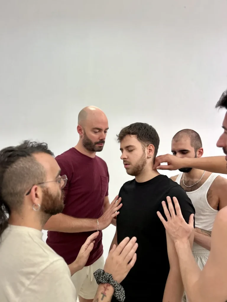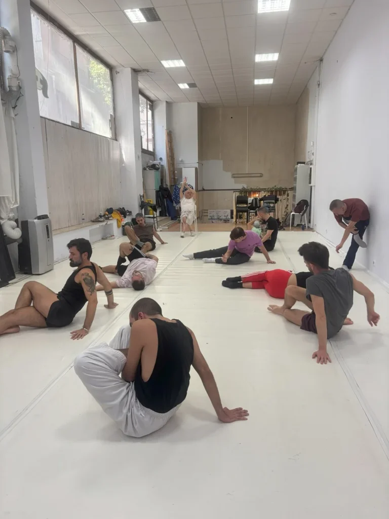 Finalizamos el entrenamiento con masajes y tacto consciente, honrando los cuerpos con los que trabajamos cada jueves en la sala de ensayo.
